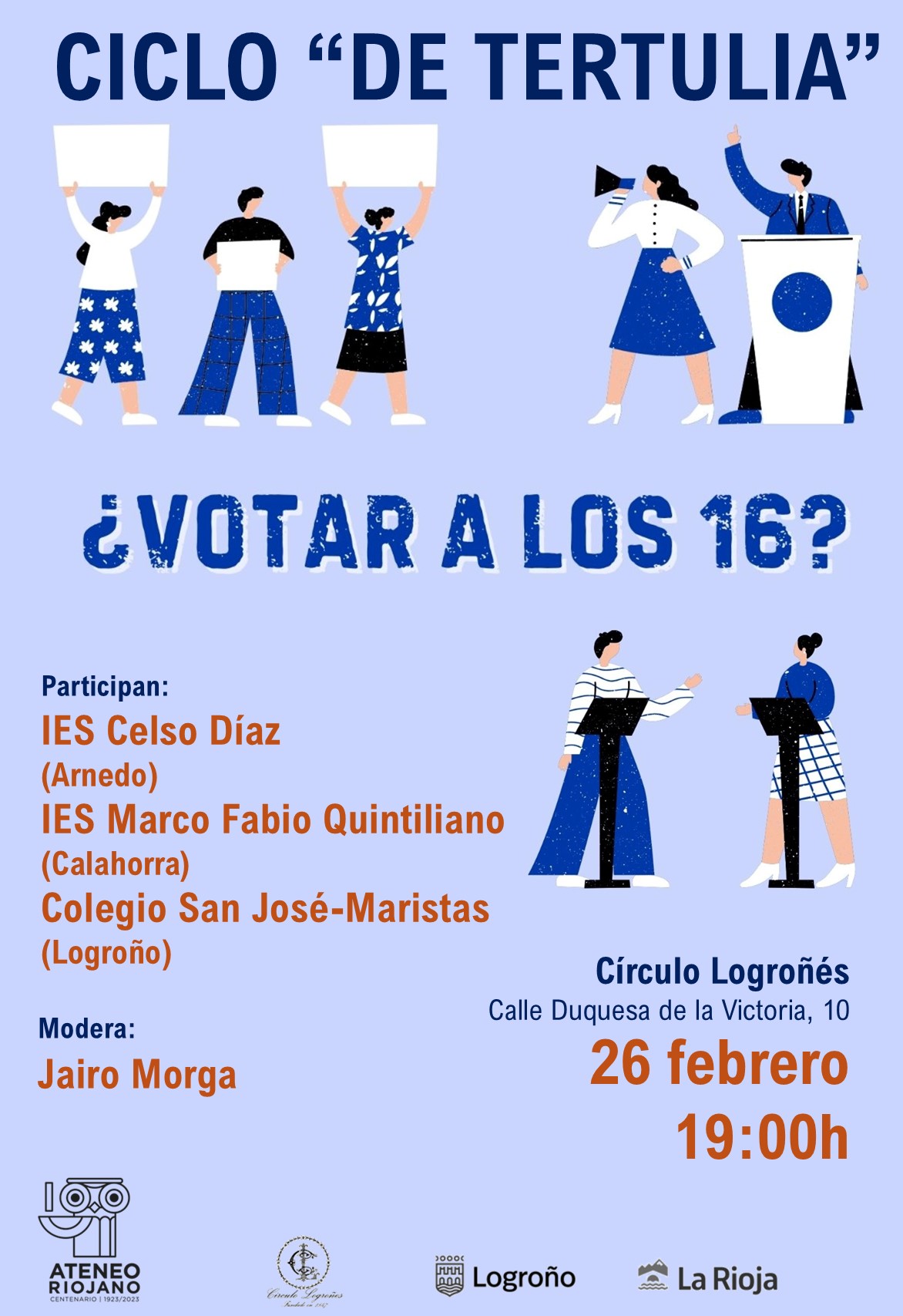 El próximo 26 de febrero, el círculo logroñés acogerá una nueva cita del Ciclo “De Tertulia” organizado por e Ateneo Riojano. Este mes se pondrá de relieve el debate sobre el adelanto de la edad legal para ejercer el derecho al voto de los 18 a los 16 años.