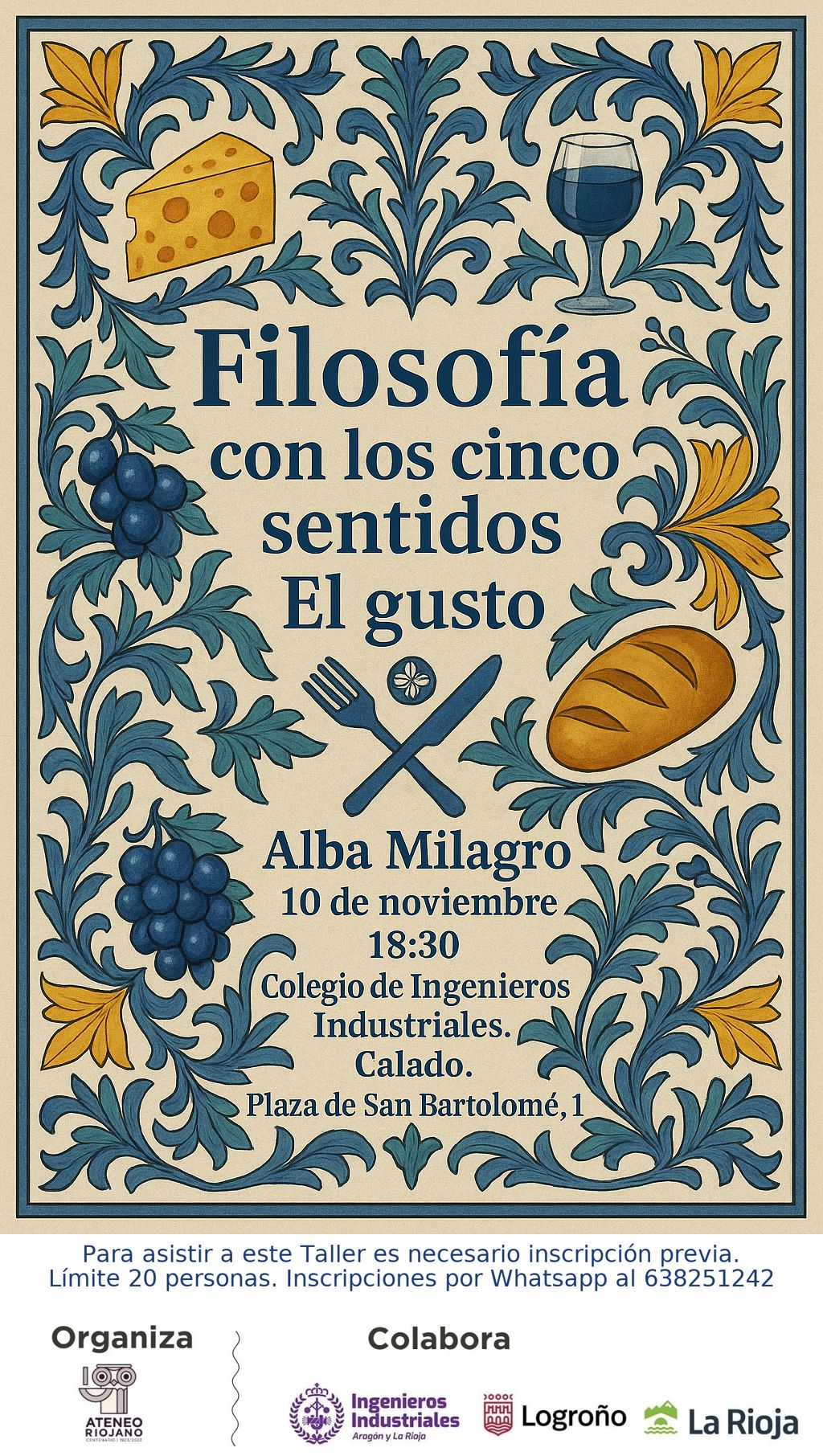 El próximo lunes hablaremos de estas y otras cuestiones a propósito del segundo de los sentidos: el gusto. Se trata de una actividad práctica basada en el diálogo, está pensada para todos los públicos y no requiere conocimientos previos.
